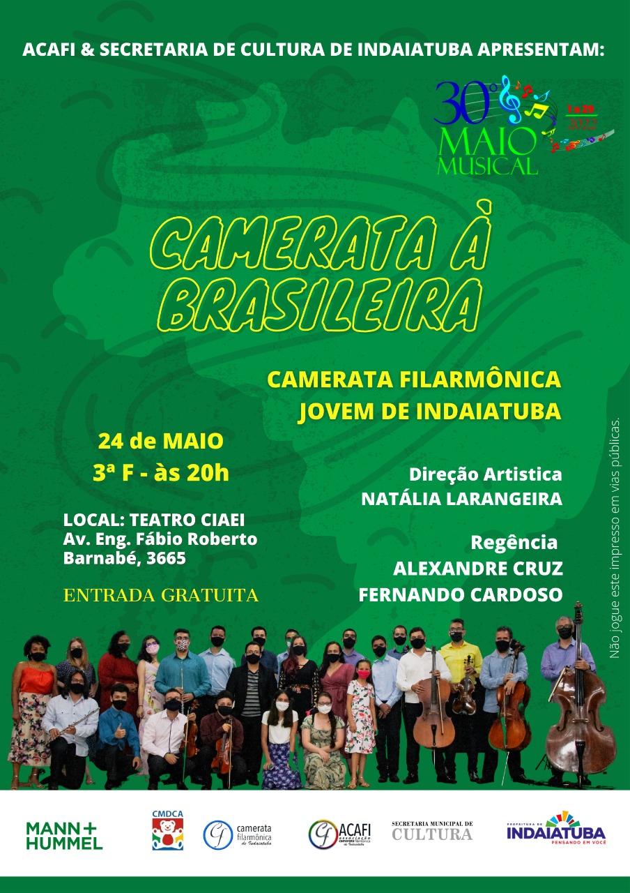 A Associação Camerata Filarmônica de Indaiatuba (ACAFI), por ocasião do Maio Musical, irá realizar o concerto gratuito “Camerata na Broadway” com a Camerata Filarmônica de Indaiatuba, sua orquestra de cordas formada por músicos profissionais, no dia 25 de maio, às 19h, no Teatro CIAEI.