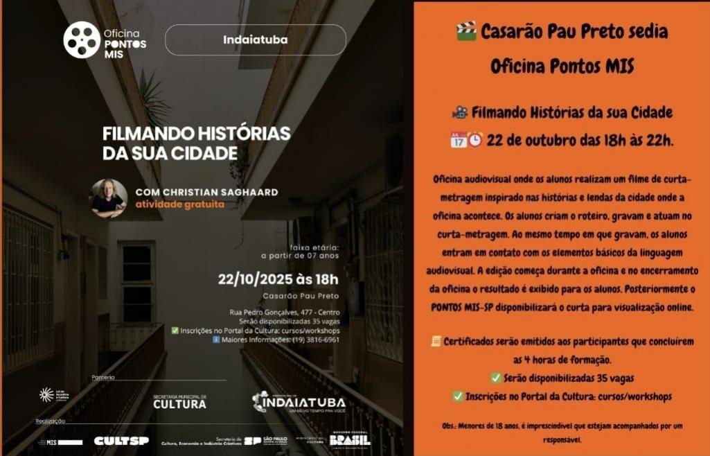 O Casarão Cultural Pau Preto, um dos marcos históricos de Indaiatuba, será o cenário para a Oficina Pontos Mis com o tema “Filmando Histórias da sua Cidade”, no dia 22 de outubro, das 18h às 22h. A atividade é uma oportunidade única para o público entrar em contato com a linguagem audiovisual, e será ministrada por Christian Saghaard, que é cineasta e coordenador/educador de oficinas e mostras audiovisuais.