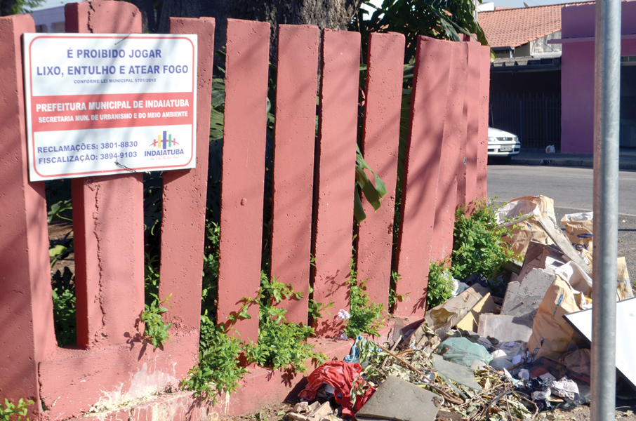 falta de conscientização A Reportagem do Jornal Exemplo® andou pelos bairros Santa Cruz e Vila Brizola e constatou muito desrespeito à legislação sobre poluição ambiental. Ironicamente a placa pede para não depositar entulhos ao passo que a população ignora e faz acontecer a lei do menor esforço. Até quando? Muito da culpa da Indaiatuba sem maquiagem é atribuída aos populares.