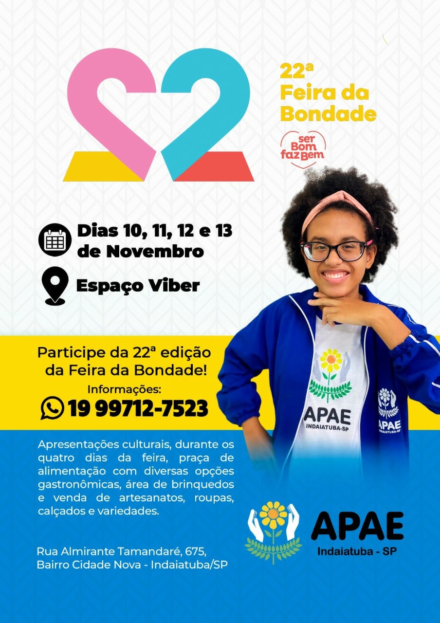 A APAE Indaiatuba (Associação de Pais e Amigos dos Excepcionais) confirmou data e local da 22ª Feira da Bondade: de 10 a 13 de novembro, no Espaço Viber. Com o lema ‘Ser bom faz bem’, o evento reunirá mais de 100 expositores, de diferentes segmentos, área gastronômica e atrações culturais ao longo dos quatro dias, com shows ao vivo, números de dança e atividades interativas.