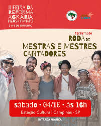 A Estação Cultura, na região central de Campinas, recebe neste dia 4 de outubro, sábado, às 16h, a Roda de Mestres, encontro gratuito que integra a programação da II Feira da Reforma Agrária Neusa Paviato. O evento reúne mestres da cultura popular e jovens artistas, promovendo uma celebração de saberes, ritmos e tradições brasileiras.