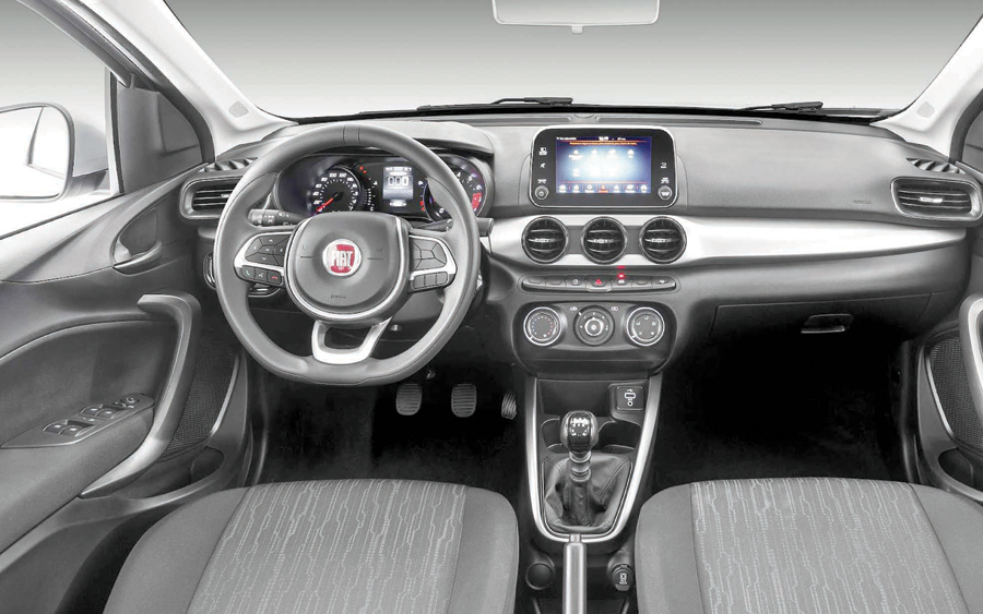 Por dentro, o visual também é moderno. Na versão de topo, uma faixa com o mesmo tom da do para-choque se estende por todo o painel, cuja superfície é feita de plástico duro, mas de textura agradável ao toque.